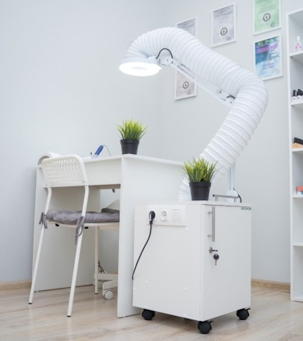 Идеальны для стационарных салонов и тех, кто принимает клиентов на одном и том же месте. Они монтируются в столешницу, не занимают дополнительного пространства и дают мощный поток воздуха прямо под руками мастера. Примером может служить Ulka Premium — вытяжка, встраиваемая в стол, с HEPA-фильтром.